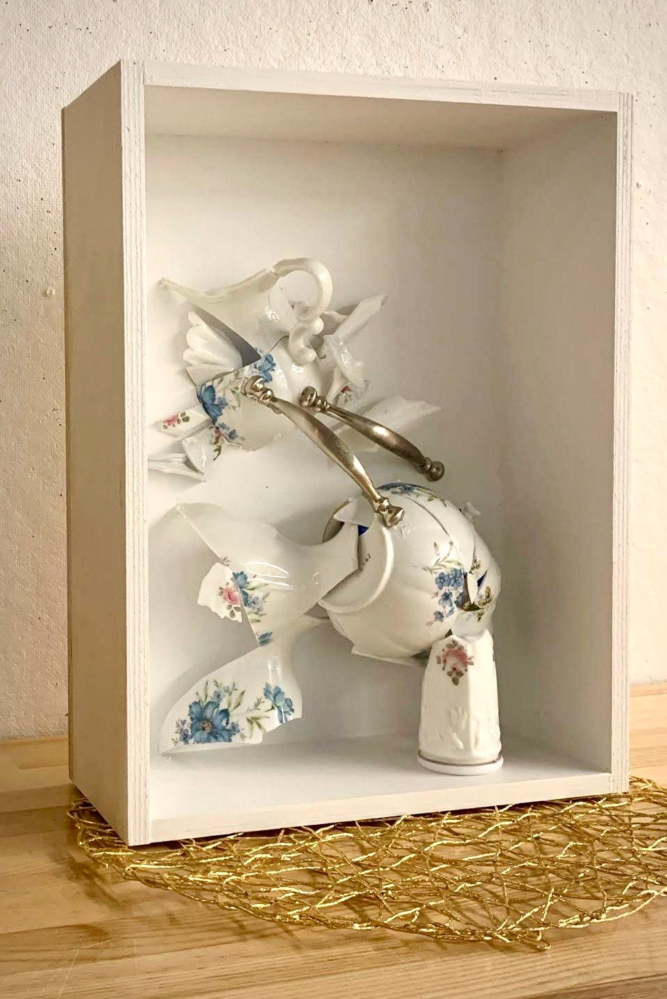 Materials: plywood constructed into a box, porcelain tea set, glass vase, drawer handles, various glues, weaved gold yarn, acrylic paint.